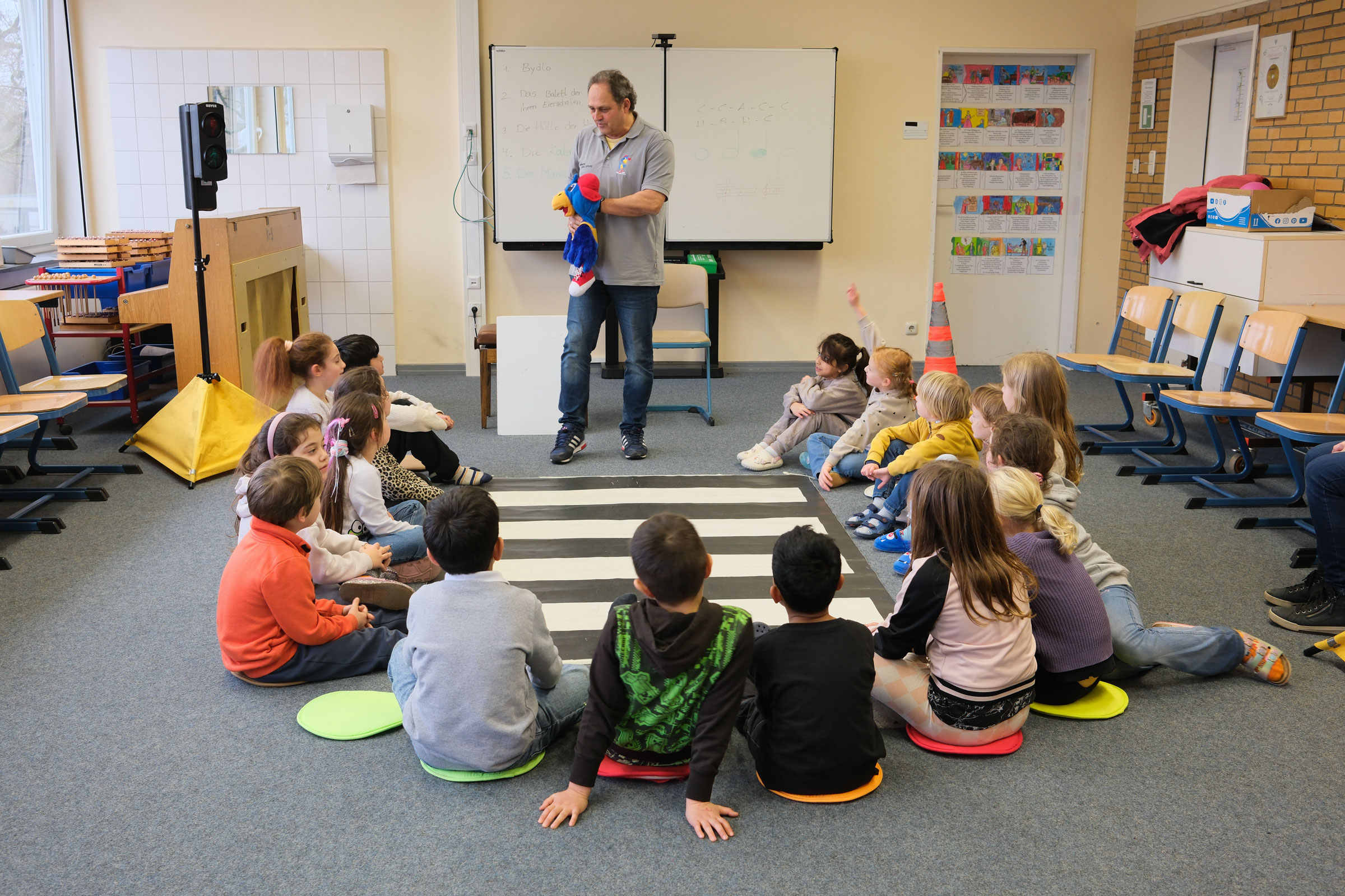 Dass Verkehrserziehung alles andere als trocken sein muss, bewies Herr Plähn von der ersten Sekunde an. Die Stunde startete schwungvoll mit einem Mitmach-Verkehrslied, das die Kinder sofort begeisterte. Anschließend wurden anhand von großen, bunten Schautafeln verschiedene Verkehrssituationen besprochen. Hier konnten die Schüler ihr Wissen testen und lernten, Gefahren frühzeitig zu erkennen.