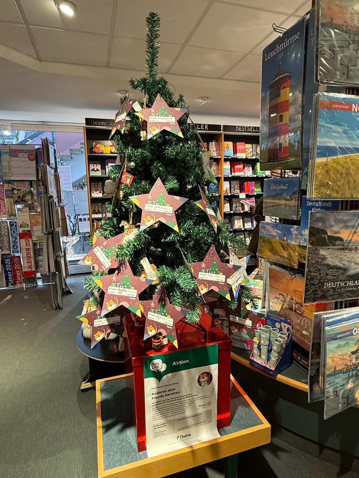 Kinder zum Lesen animieren – Das will der Rotary Club mit seinem Projekt „Ein Buch zu Weihnachten“ erreichen. Viertklässler durften sich ihr Wunschbuch in der Buchhandlung aussuchen. Für jedes Buch hängt ein Wunschstern am Baum im Thalia Bücherwurm.