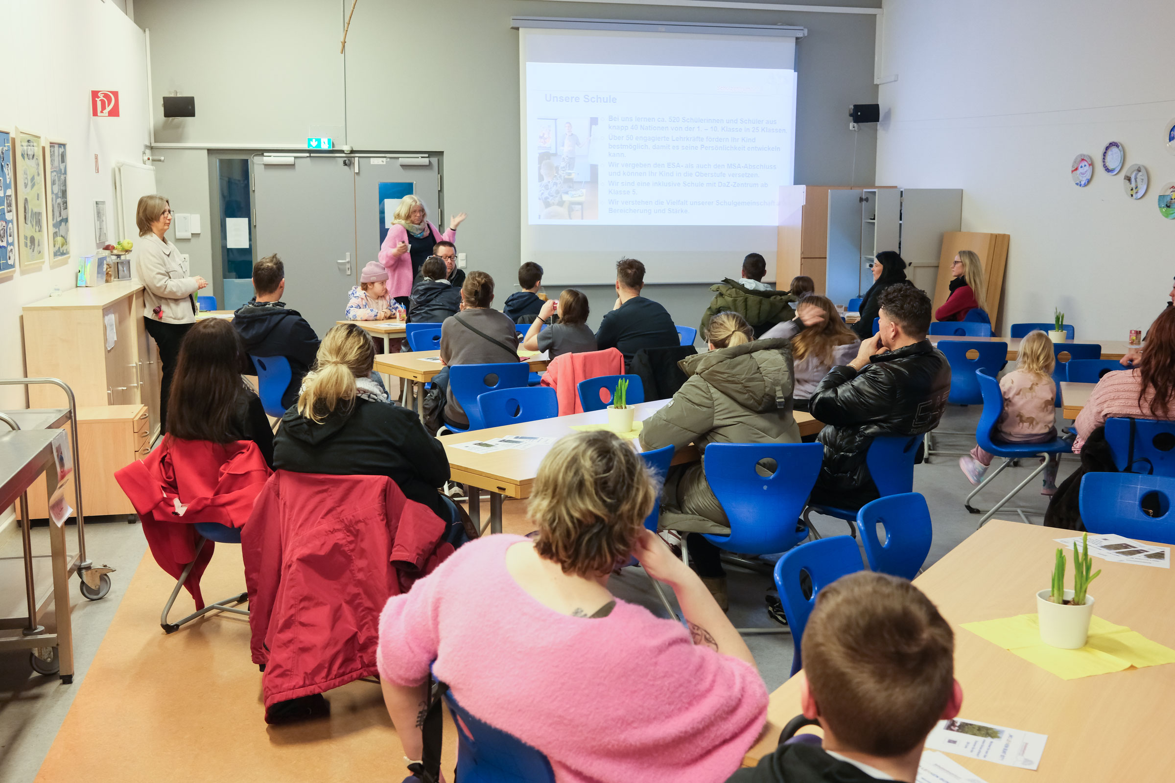 Um 17:30 gab es in der Mensa eine Präsentation der Schule, bei der offengebliebene Fragen zum zukünftigen Schulbesuch beantwortet wurden.